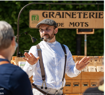 La graineterie de mots est un entresort théâtral, écrit, conçu, plié, collé, cloué pendant l'année 2018 pour donner un spectacle poétique et humoristique. La graineterie de mots, c'est une charrette et un colporteur, un entremetteur qui invite à semer et à déguster des mots : des rares, des aromatiques, des sauvages, des beaux ou des étranges. 350 mots, et 350 paquets de graines différents. Prédilection, Fanfreluche, Réminiscence, Nonobstant, Panacée, Zizanie, Seum ou Boloss, Escarcelle ou Chimérique, A fortiori ou Casus Belli… Il y en a pour tous les goûts.